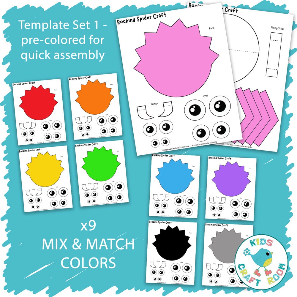 - Pre-colored spider templates come in 9 different mix and match rainbow colors.